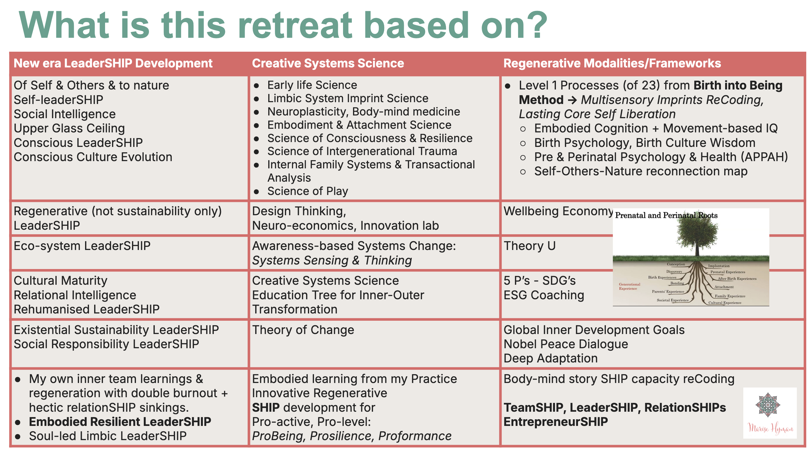 The Birth into Being Method bridges science and wisdom to nurture healthy beginnings and create a more conscious, connected world through recognising the impact of early life experiences on lifelong human development. From the clinical lens of prenatal and perinatal psychology, we perceive that unmet needs, stress, and trauma experienced by the baby during prenatal, birth and neonatal period and subsequent events in the formation of SELF identity (0-7 yrs + 7-18yrs when prefrontal rational cortex is underdeveloped) can be attributed to be the origins of nearly every mental health disorder and attachment issue in relationships. This retreat recognises, that we are never to old to reCode early life limiting imprints, into imprints that serve humans, relationships and humanity.